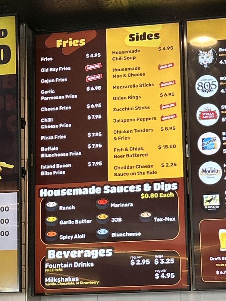 Dive into our Island Bacon Bliss Fries, made from fresh Russet potatoes, cut into perfect /" straight fries, and double-fried for a crispy outside and creamy inside texture. These fries are topped with crispy applewood smoked bacon, caramelized grilled onions, house-made cheddar cheese sauce, and our special JJB sauce for a tantalizing savory experience.